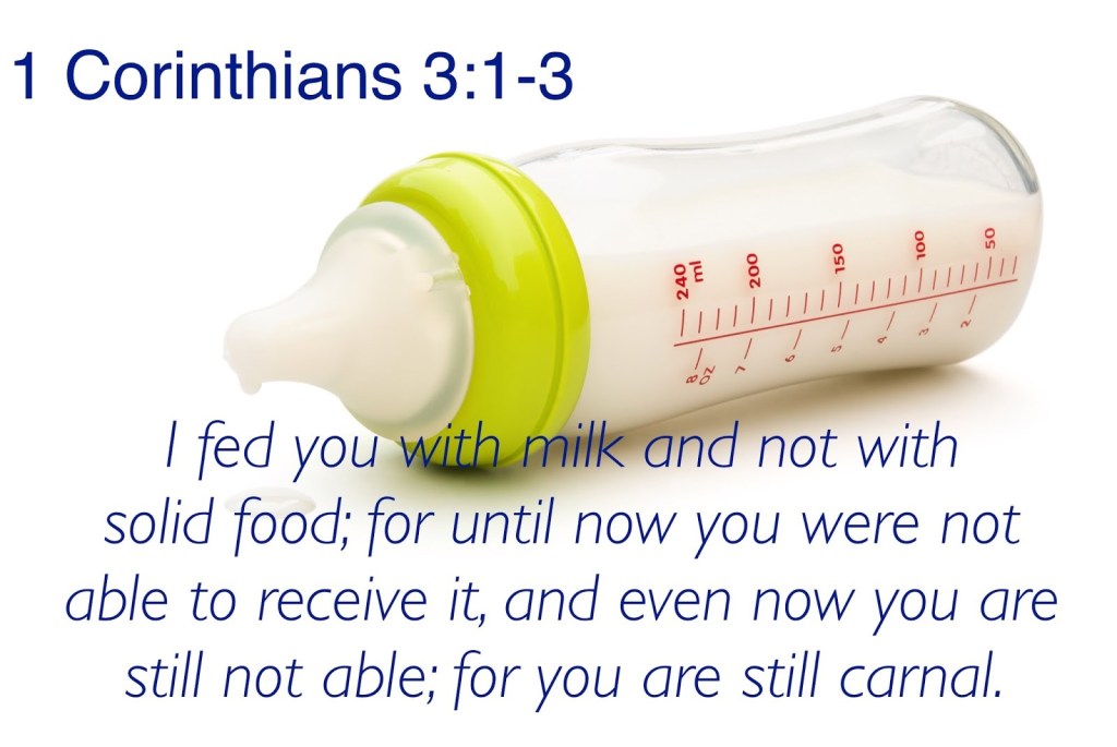 3 Brothers and sisters, when I was with you I found it impossible to speak to you as those who are spiritually mature people, for you are still dominated by the mind-set of the flesh. And because you are immature infants in Christ, 2 I had to nurse you and feed you with “milk,”[a] not with the solid food of more advanced teachings, because you weren’t ready for it. In fact, you are still not ready to be fed solid food, 3 for you are living your lives dominated by the mind-set of the flesh. Ask yourselves: Is there jealousy among you? Do you compare yourselves with others? Do you quarrel like children and end up taking sides? If so, this proves that you are living your lives centered on yourselves, dominated by the mind-set of the flesh, and behaving like unbelievers. 4 For when you divide yourselves up in groups—a “Paul group” and an “Apollos group”[b]—you’re acting like people without the Spirit’s influence.